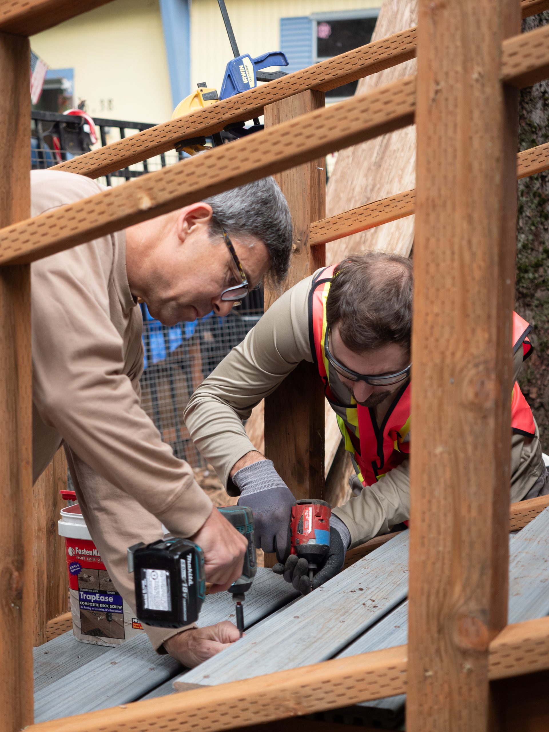 Together, we completed four repair projects for low-income homeowners in these neighborhoods. Projects included a major yard cleanup, fence repair, weatherization, and the installation of accessible exterior stairs.